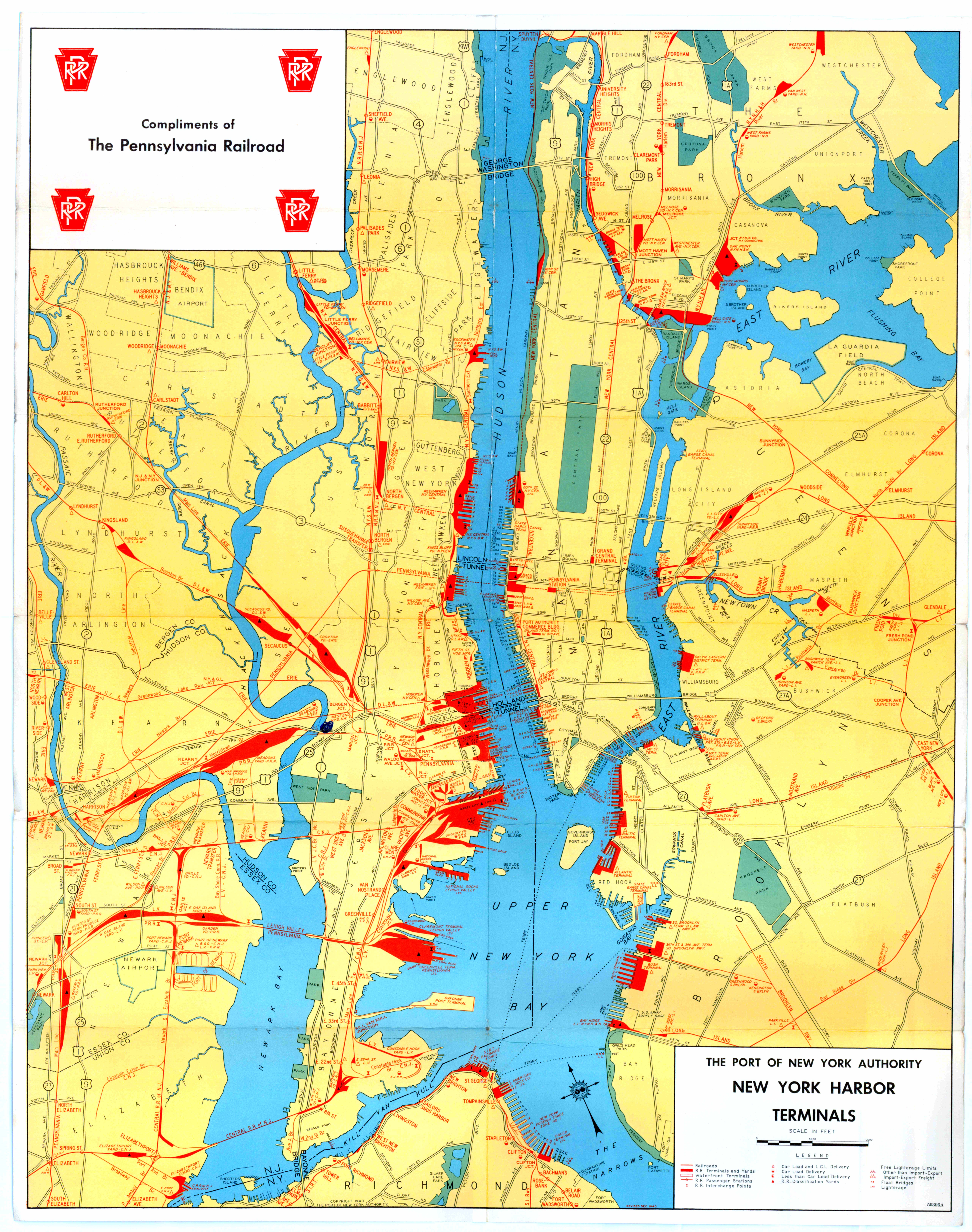 Please keep in mind that this map is from 1943, and some pier stations may have been relinquished or may not have opened yet. Only the piers marked in red were railroad operated, but remember: carfloats and lighters could be spotted at any pier for a customer.