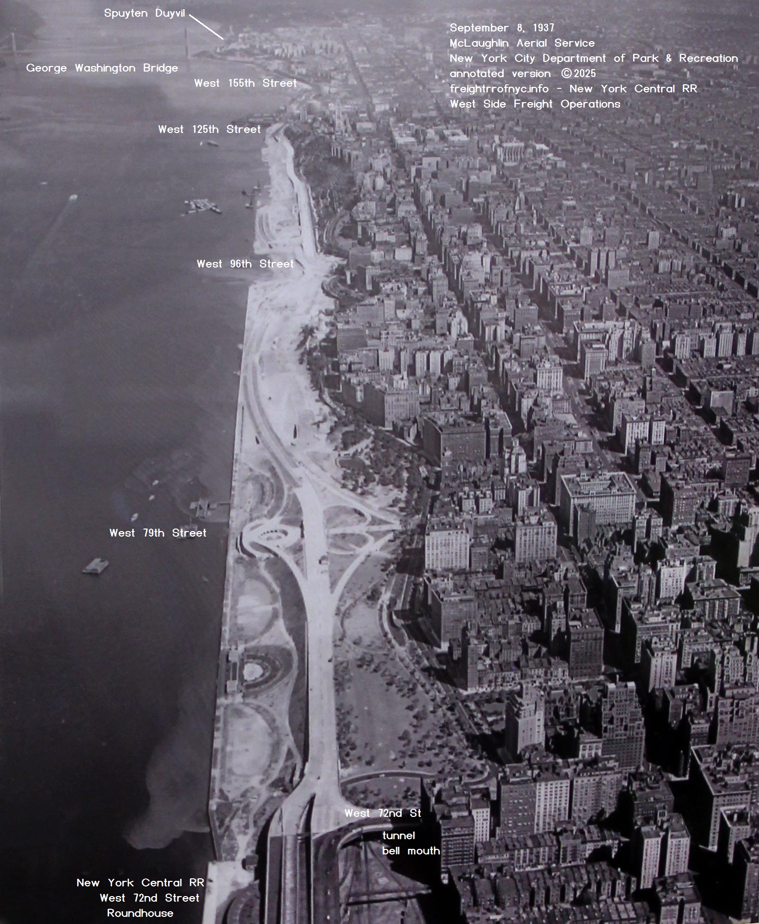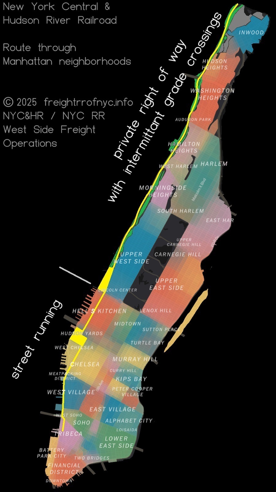 Unlike the other Class 1 railroads that did come to have offline freight terminals in Manhattan, such as the Pennsylvania; Lehigh Valley; Erie; Central Railroad of New Jersey; and the New York, New Haven & Hartford Railroads; the New York Central Railroad had an unbroken direct rail connection to and from Manhattan to the mainland United States rail network. Ironically, this physical connection still exists to this very day, albeit slightly rerouted to get the trains off the streets (which we will address in a later chapter on this page), and is now under Amtrak usage for passenger service.