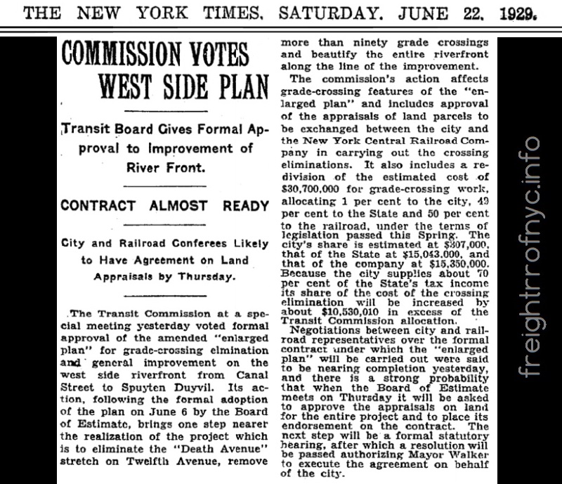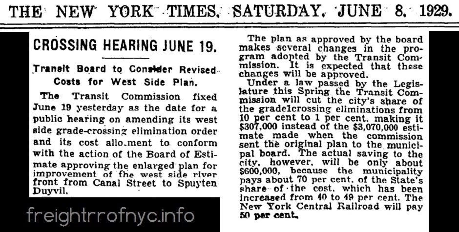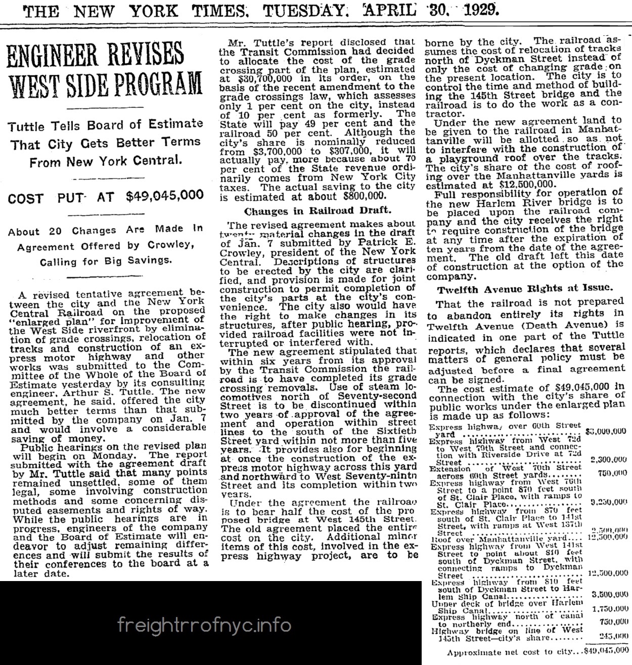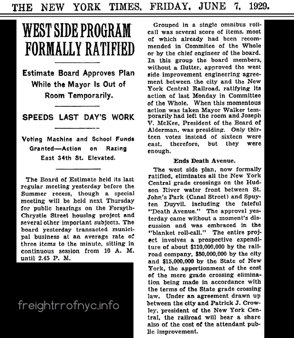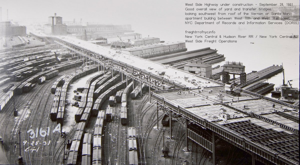 In April 1920, Alfred H. Smith put the case quite succinctly in an address at the Merchants Association of New York City: "Manhattan Island lives on a hand to mouth existence. Because of the dearth of warehouses and storage facilities and of modern equipment for handling freight. The unnecessary costs and losses yearly are prodigious; [and] none but a rich and growing city could have borne the burden." In other words, because of the warehouses and storage facilities on the island, the City feeds and clothes itself from outside supplies. Remove the railroad, and you remove the warehouses and industries and income for thousands of people who work at these facilities. Remove that and the city withers. This statement followed another in which the endless delays of the City and State of New York was criticized and the United States Railroad Administration refusing to grant increases in freight rates, comparable to those in wages. It was in short, a statement made to the effect of "shit or get off the pot." One plan put forth, had the railroad completely sub-grade starting with a tunnel that went under the Harlem River and Spuyten Duyvil; all the way to at least, the West 30th Street Yards. The plan was for the City to build the tunnel, with freight stations alongside the route, and they would lease the railroad yearly rights to operate their trains there. Another plan was for an elevated railroad from Spuyten Duyvil to West 72nd Street, then enter a subway with service through the basements to those buildings desiring such service. Much like todays passenger carrying subways in New York City, only substituting people for freight. A more realistic plan was retain the existing bridge at Spuyten Duyvil, with the tracks sub-grade from there to West 60th Street; then an elevated line from West 60th Street to St. John's Park. Two of the more audacious plans were outlined in the New York, New Jersey Port and Harbor Development Commission Joint Report with Comprehensive Plan and Recommendations - 1920; on pages 231 and 239. The estimated cost of the elevated plan, was $262,000,000 (adjusted for inflation for 2025: $4,244,085,600). The tunnel proposal was estimated to cost $250,000,000 (2025: $4,050,000,000 - and I haven;t quite figured out how the tunnel plan was cheaper than the elevated - tunneling is always more expensive. A similar plan to these, yet substituting cable driven narrow gauge carts is also shown on page 269. Well, one can dream, no? From what I gather from the synopsis of the following document, it really wasn't the railroads fault. Each City administration wanted "their vision" to be the one that was implemented. Then, with each City agency that became involved, no one really knew who had jurisdiction: "In 1911 (chapter 777 of laws of 1911) the West side Improvement was made the subject of special legislation, and the carrying out of the improvement was left generally for direct action between the City authorities and the railroad company. Under the Mitchel Administration plans for carrying out the West Side Improvement were developed in great detail, but at the last the proposed arrangement failed of approval. In 1917, the special legislation of 1911 was amended to confer certain jurisdiction of the (state) Public Service Commission for First District (chapter 719, laws of 1917). On another front, an agreement would be reached, whereas the State of New York was to pay one quarter of the cost of this grade separation / realignment project, the New York Central Railroad was to pay three quarters. And true to fashion, the State of New York balked, stating it did not have the funds to cover their full 25% portion. With surprising congeniality and good faith, the New York Central Railroad offered to cover the States' portion and defer reimbursement arrangements and repayment to a later date. Not surprisingly, I cannot locate any documentation alluding that the State finally paying its due share of apportionment, but it may have been paid in installments or reduced taxation. Then a plan arose that a double decker highway and railroad elevated be constructed. This plan would eliminated most of the grade crossings on Twelfth Avenue, but did little to ameliorate the issue between the pedestrians and horse drawn traffic at street level at Midtown. This plan amounted to only the Miller or West Side Elevated Highway being built for automobile traffic only. So, back to the bargaining table they went. The goals of all were to get the trains off the street, and who was going to cover the municipality's fair share of fiscal responsibility. .. . 1923
