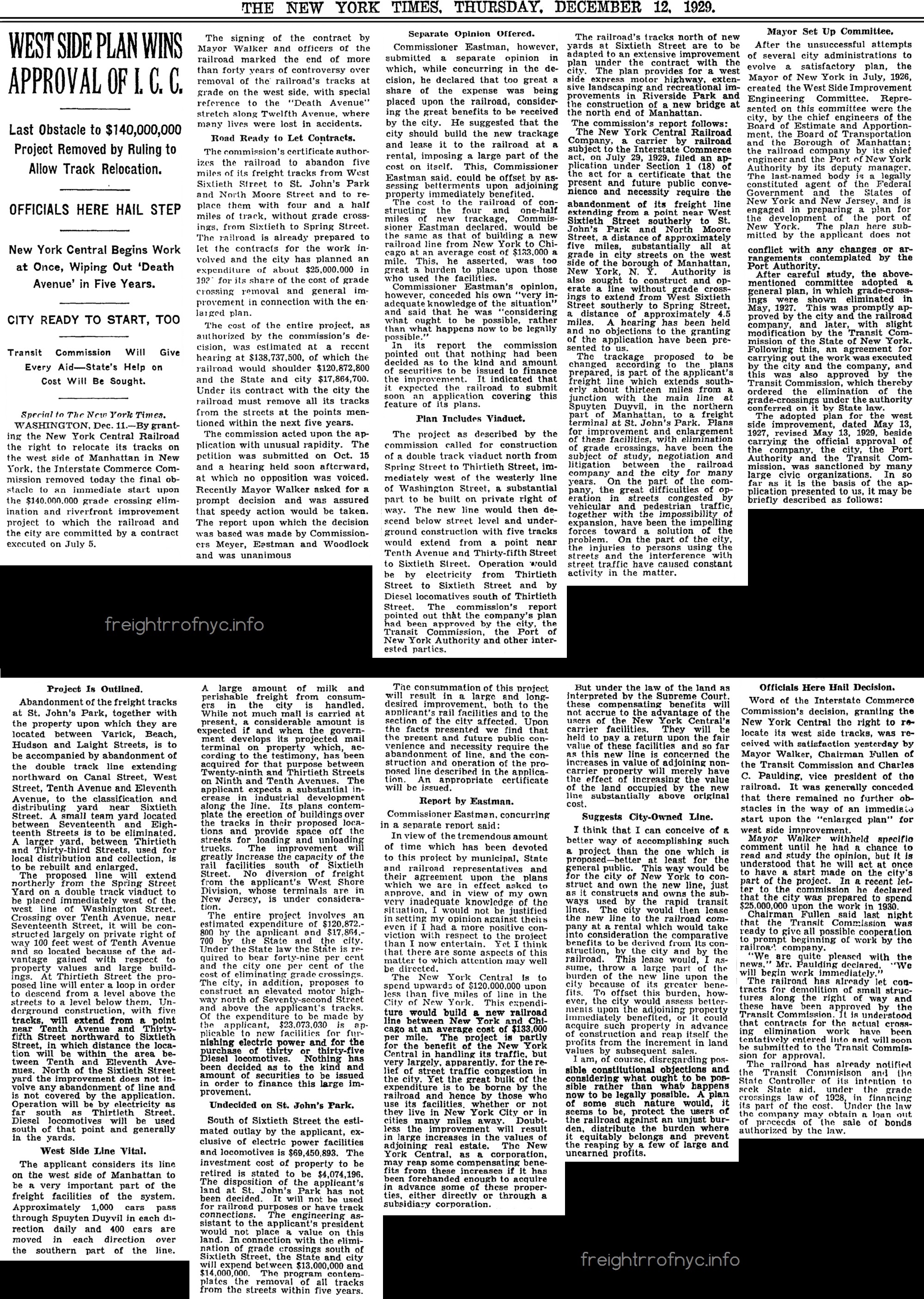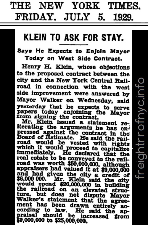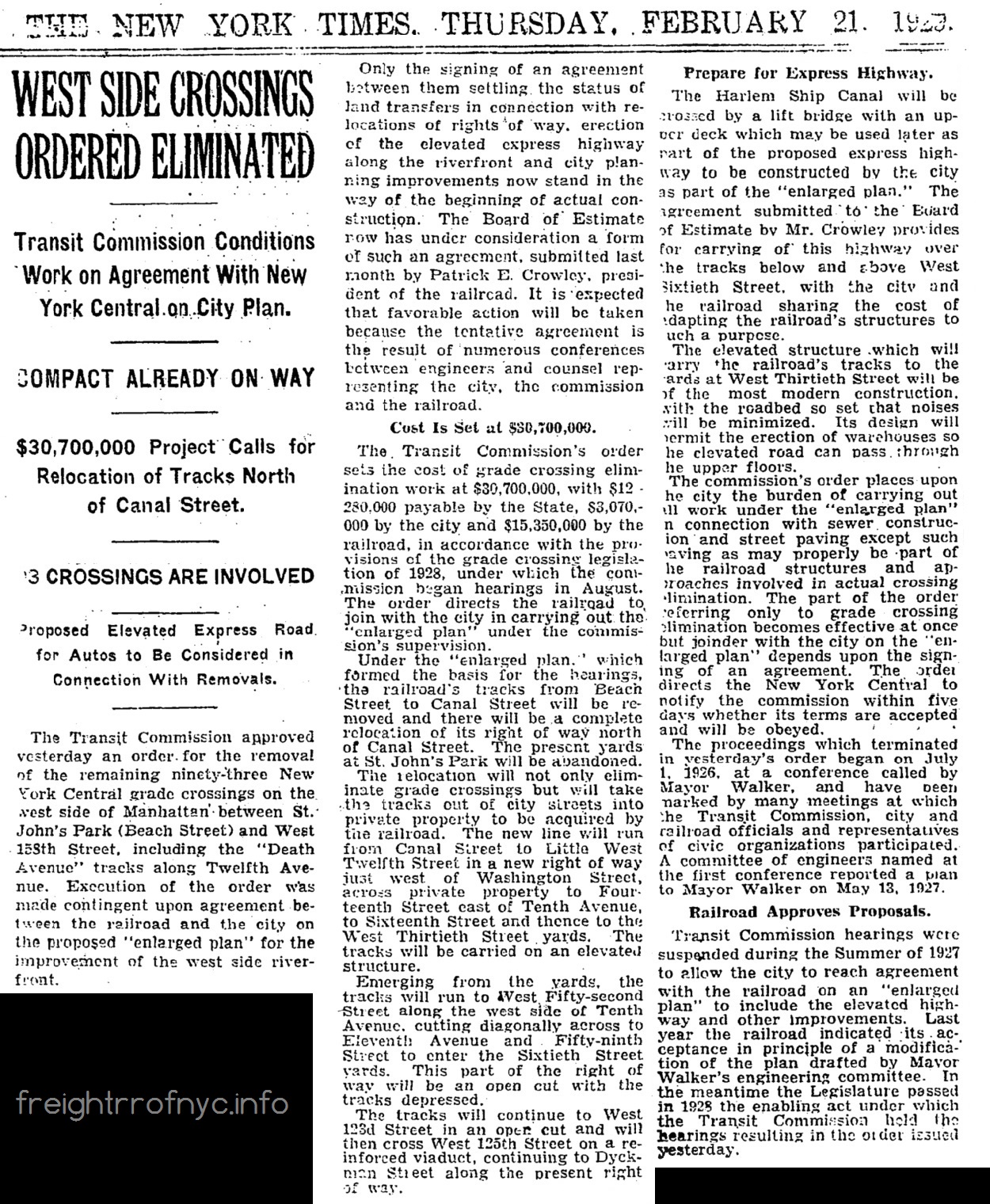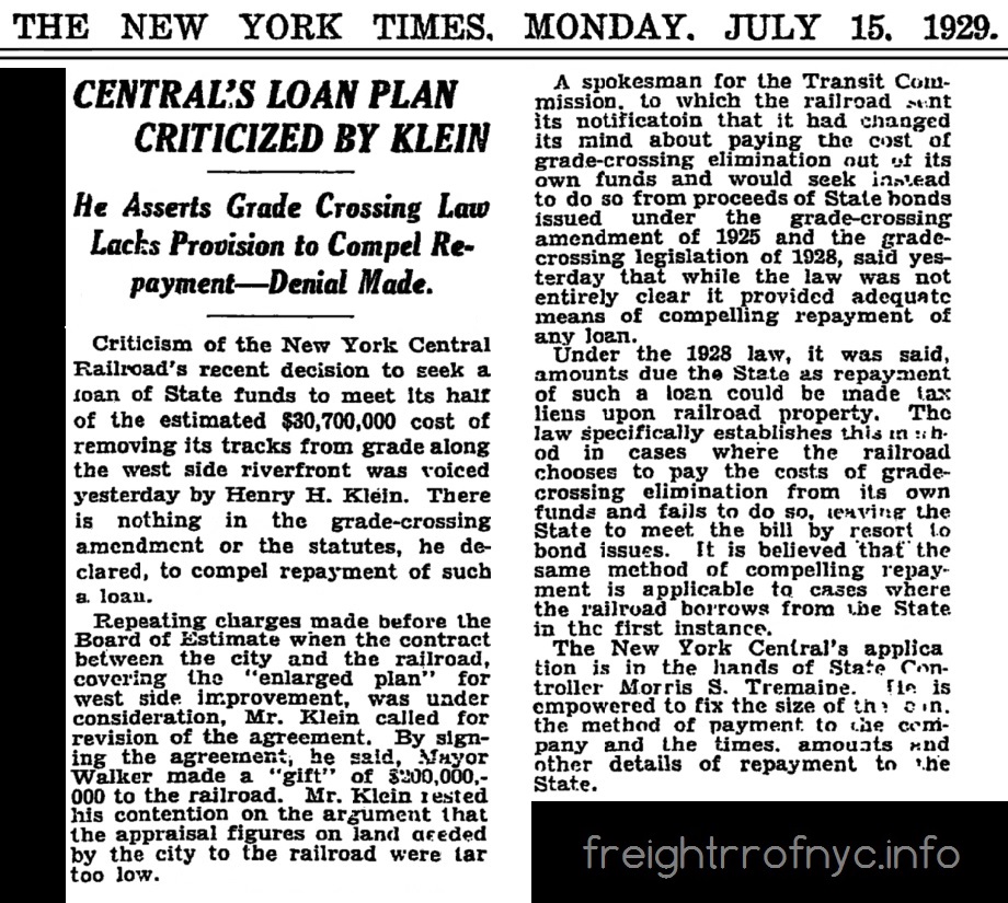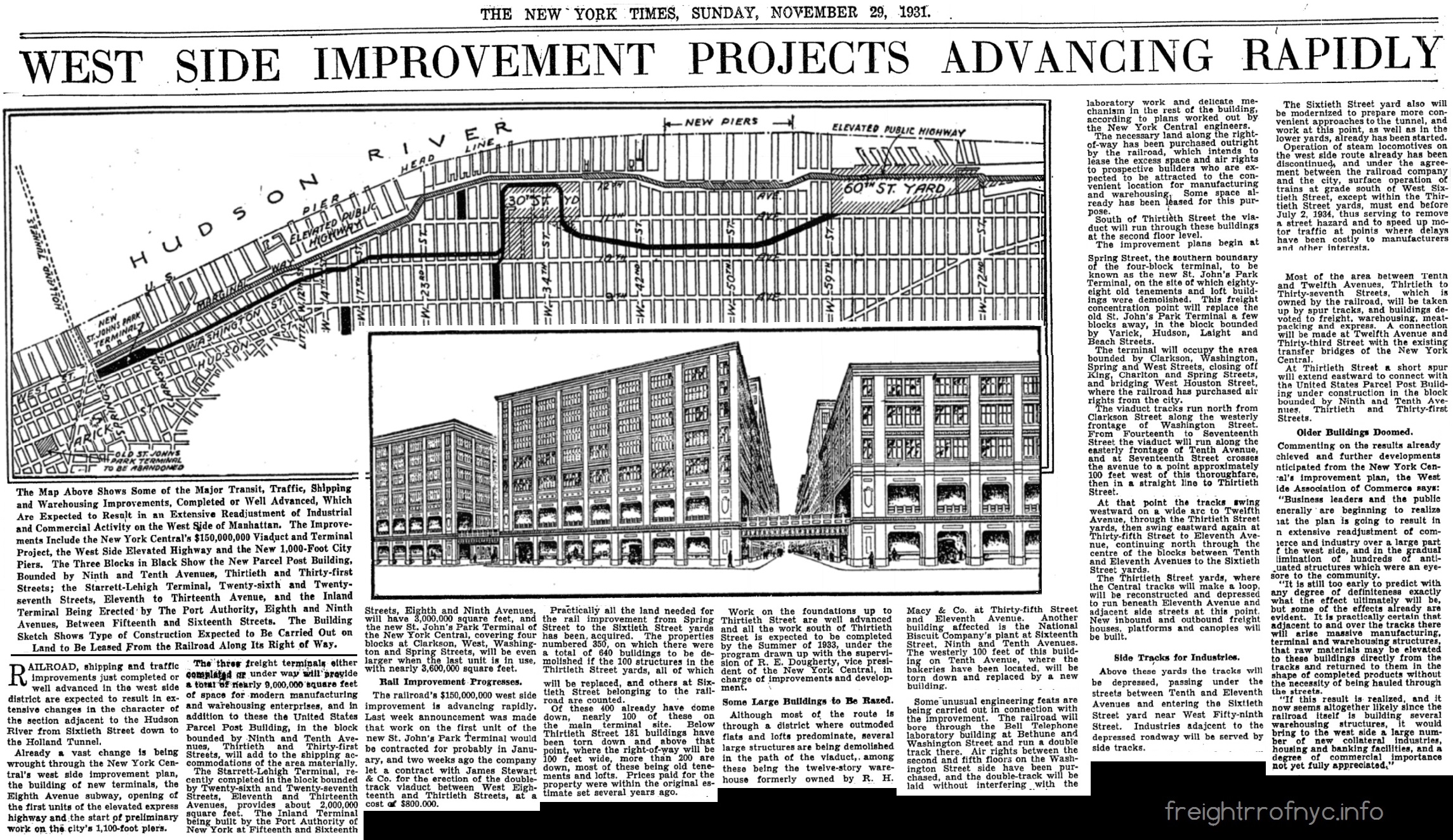 In April 1920, Alfred H. Smith put the case quite succinctly in an address at the Merchants Association of New York City: "Manhattan Island lives on a hand to mouth existence. Because of the dearth of warehouses and storage facilities and of modern equipment for handling freight. The unnecessary costs and losses yearly are prodigious; [and] none but a rich and growing city could have borne the burden." In other words, because of the warehouses and storage facilities on the island, the City feeds and clothes itself from outside supplies. Remove the railroad, and you remove the warehouses and industries and income for thousands of people who work at these facilities. Remove that and the city withers. This statement followed another in which the endless delays of the City and State of New York was criticized and the United States Railroad Administration refusing to grant increases in freight rates, comparable to those in wages. It was in short, a statement made to the effect of "shit or get off the pot." One plan put forth, had the railroad completely sub-grade starting with a tunnel that went under the Harlem River and Spuyten Duyvil; all the way to at least, the West 30th Street Yards. The plan was for the City to build the tunnel, with freight stations alongside the route, and they would lease the railroad yearly rights to operate their trains there. Another plan was for an elevated railroad from Spuyten Duyvil to West 72nd Street, then enter a subway with service through the basements to those buildings desiring such service. Much like todays passenger carrying subways in New York City, only substituting people for freight. A more realistic plan was retain the existing bridge at Spuyten Duyvil, with the tracks sub-grade from there to West 60th Street; then an elevated line from West 60th Street to St. John's Park. Two of the more audacious plans were outlined in the New York, New Jersey Port and Harbor Development Commission Joint Report with Comprehensive Plan and Recommendations - 1920; on pages 231 and 239. The estimated cost of the elevated plan, was $262,000,000 (adjusted for inflation for 2025: $4,244,085,600). The tunnel proposal was estimated to cost $250,000,000 (2025: $4,050,000,000 - and I haven;t quite figured out how the tunnel plan was cheaper than the elevated - tunneling is always more expensive. A similar plan to these, yet substituting cable driven narrow gauge carts is also shown on page 269. Well, one can dream, no? From what I gather from the synopsis of the following document, it really wasn't the railroads fault. Each City administration wanted "their vision" to be the one that was implemented. Then, with each City agency that became involved, no one really knew who had jurisdiction: "In 1911 (chapter 777 of laws of 1911) the West side Improvement was made the subject of special legislation, and the carrying out of the improvement was left generally for direct action between the City authorities and the railroad company. Under the Mitchel Administration plans for carrying out the West Side Improvement were developed in great detail, but at the last the proposed arrangement failed of approval. In 1917, the special legislation of 1911 was amended to confer certain jurisdiction of the (state) Public Service Commission for First District (chapter 719, laws of 1917). On another front, an agreement would be reached, whereas the State of New York was to pay one quarter of the cost of this grade separation / realignment project, the New York Central Railroad was to pay three quarters. And true to fashion, the State of New York balked, stating it did not have the funds to cover their full 25% portion. With surprising congeniality and good faith, the New York Central Railroad offered to cover the States' portion and defer reimbursement arrangements and repayment to a later date. Not surprisingly, I cannot locate any documentation alluding that the State finally paying its due share of apportionment, but it may have been paid in installments or reduced taxation. Then a plan arose that a double decker highway and railroad elevated be constructed. This plan would eliminated most of the grade crossings on Twelfth Avenue, but did little to ameliorate the issue between the pedestrians and horse drawn traffic at street level at Midtown. This plan amounted to only the Miller or West Side Elevated Highway being built for automobile traffic only. So, back to the bargaining table they went. The goals of all were to get the trains off the street, and who was going to cover the municipality's fair share of fiscal responsibility. .. . 1923
