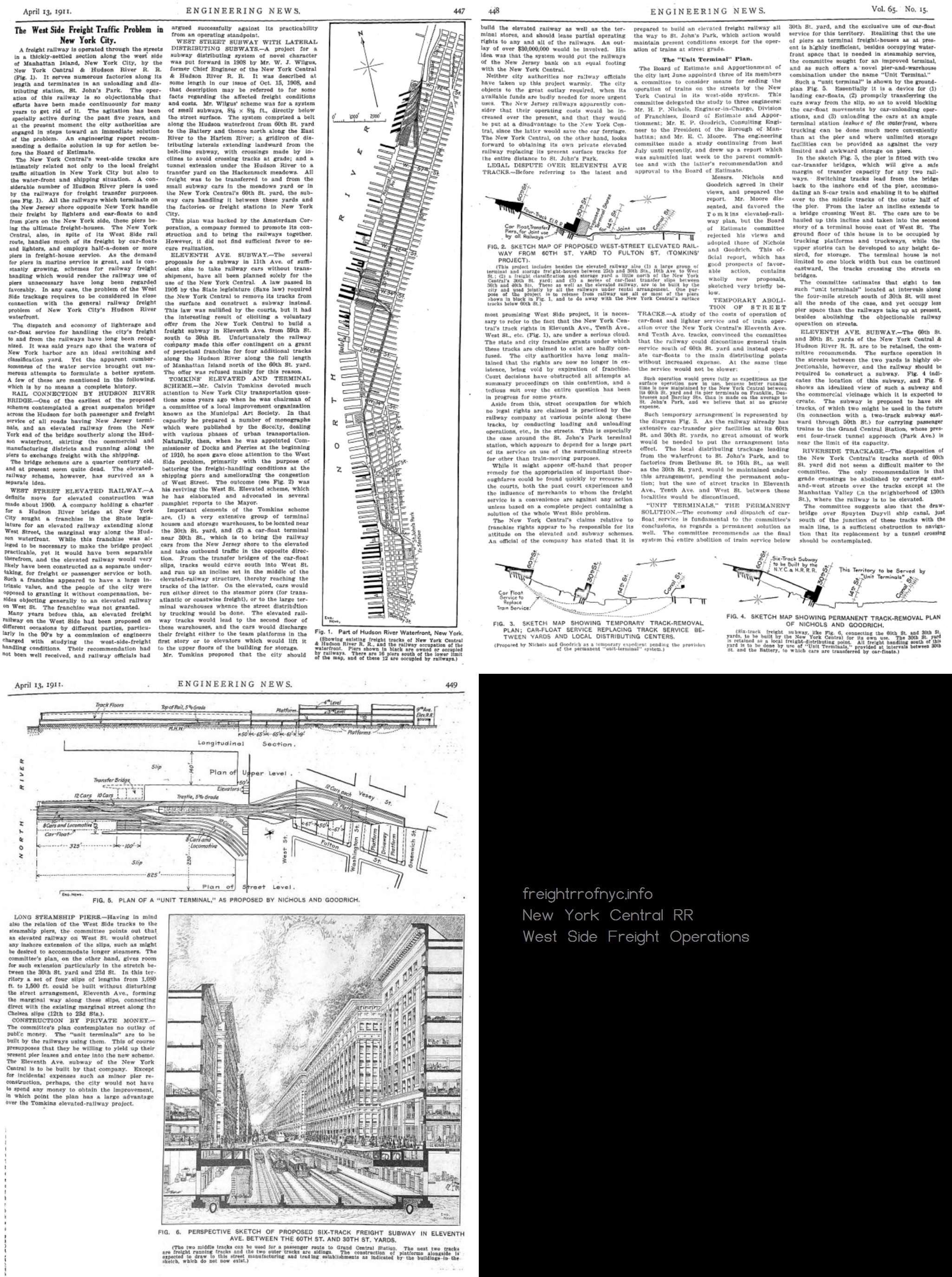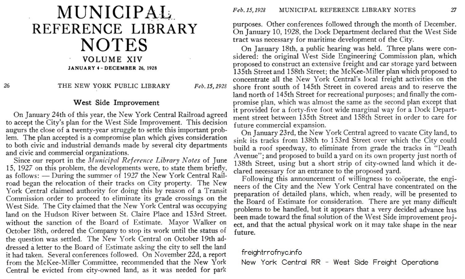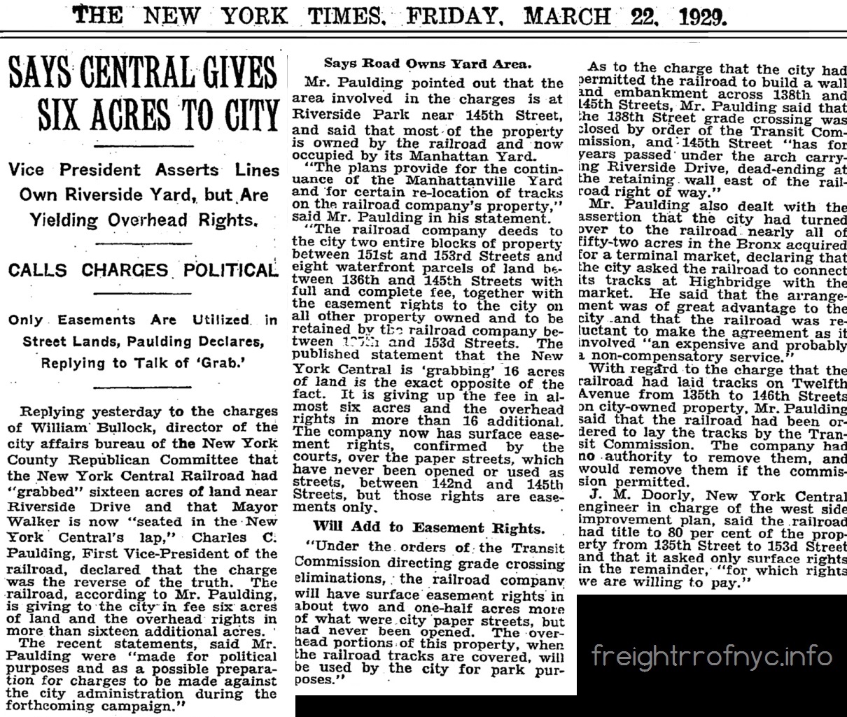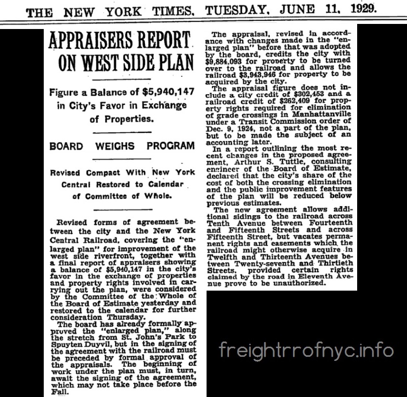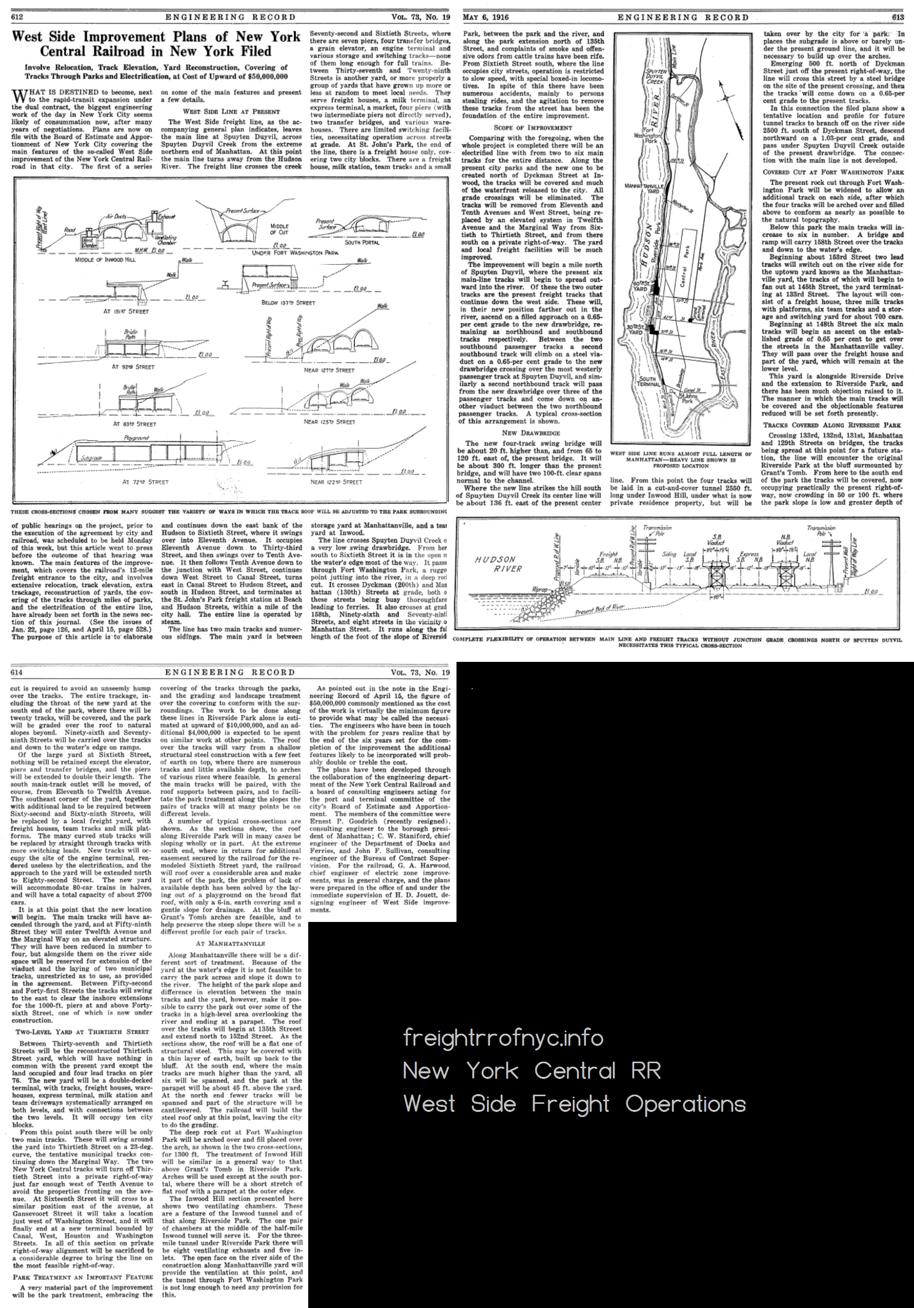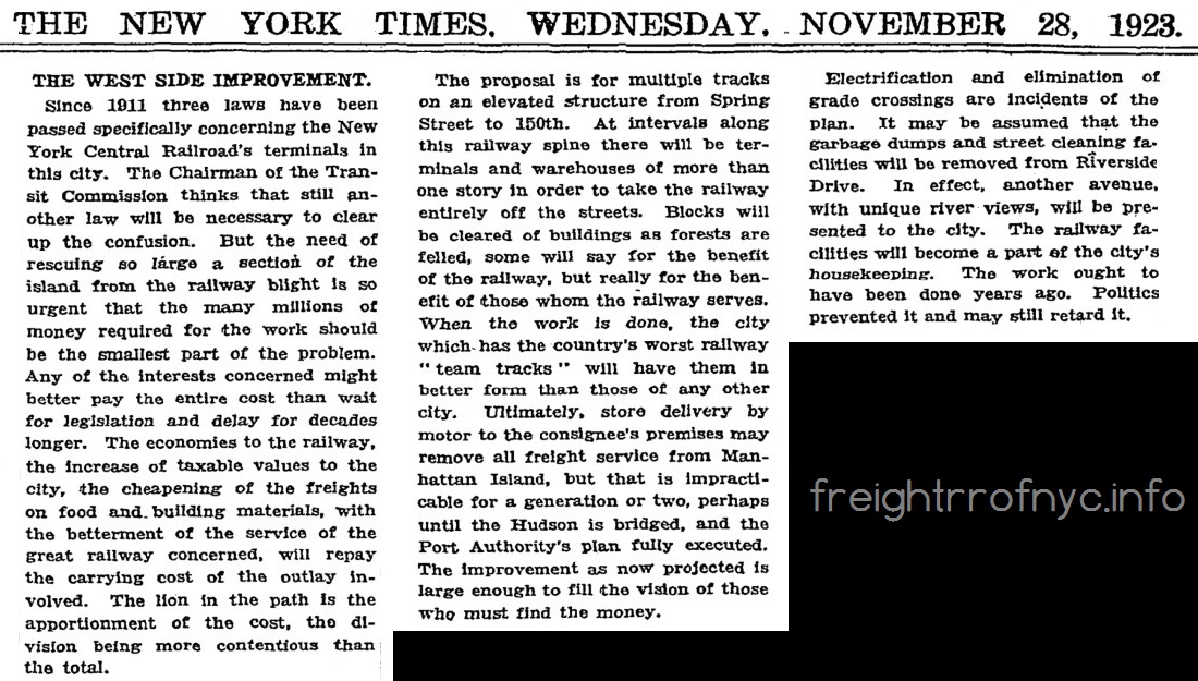 Make no mistake, the New York Central wanted their operations off the streets of lower Manhattan as well; and as the City owned the streets, there was little recourse. As for the Riverside Park vicinity, the Central apparently owned it rights of way through portions of the park. When it came to who was going to pay for these "improvements", the railroad accepted the fact they would have to pay for most of it, but they rightfully were not going to pay for all of it. And the issue wasn't simply about money. There were also matter of property ownership and rights involved. The Central had property and rights that the City wanted, particularly through Riverside Park. The City had property and rights that the Central needed to relocate their tracks. The City; or more accurately, the community boards and resident organizations; were adamant about not giving up a square inch; "the parkland must be preserved." This left the railroad in a position frequently known as being between a rock and hard place. It could not relocate without some acquisition of land, and the City wanted the railroad to give up a lot of what it owned in the name of community improvements. The affluents that resided along Riverside Drive were adamant about not giving up and city parkland for the railroad, but yet they wanted the railroad to move. That is pretty much it in a nutshell. One of the more succinct outlines of the issue comes from the following document: West Side Improvement - 22nd Annual Report of the American Scenic & Historical Preservation Society - 1917 but I warn you, its 32 pages in length. That demonstrates how complicated the issue was. And in April, the United States entered World War I and changed the priorities for several years. But, while both minor dithering between the City and the Railroad commenced, and some major dithering in Europe; the freight demands of Manhattan was growing at an exponential rate. Thus began over a decade of negotiations, plans, counter-plans, court hearings and compromises; before an actual shovelful of dirt was moved. The specific details are contained within the following three references (the first two of which are open source):