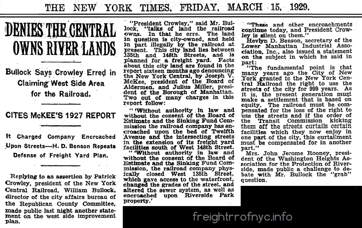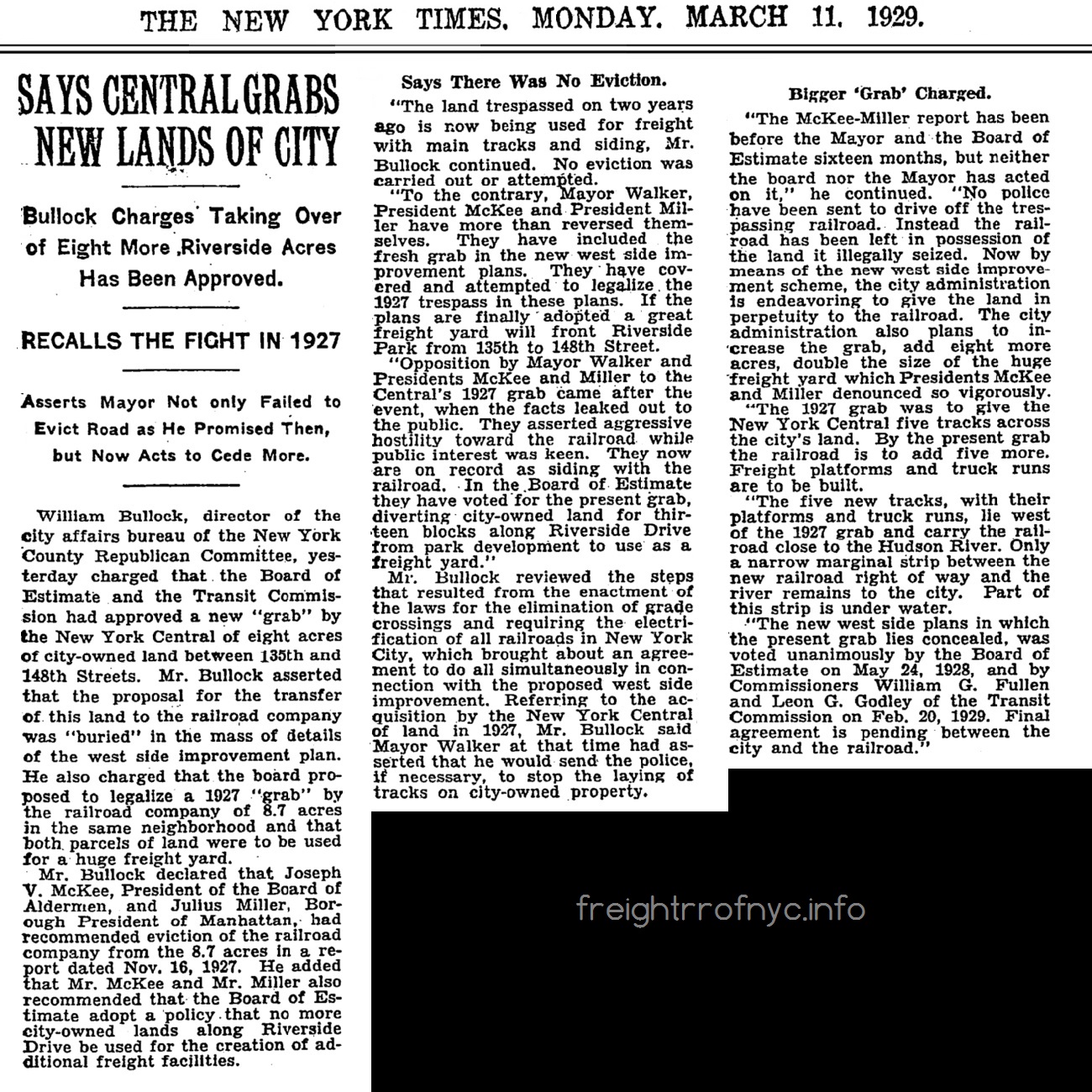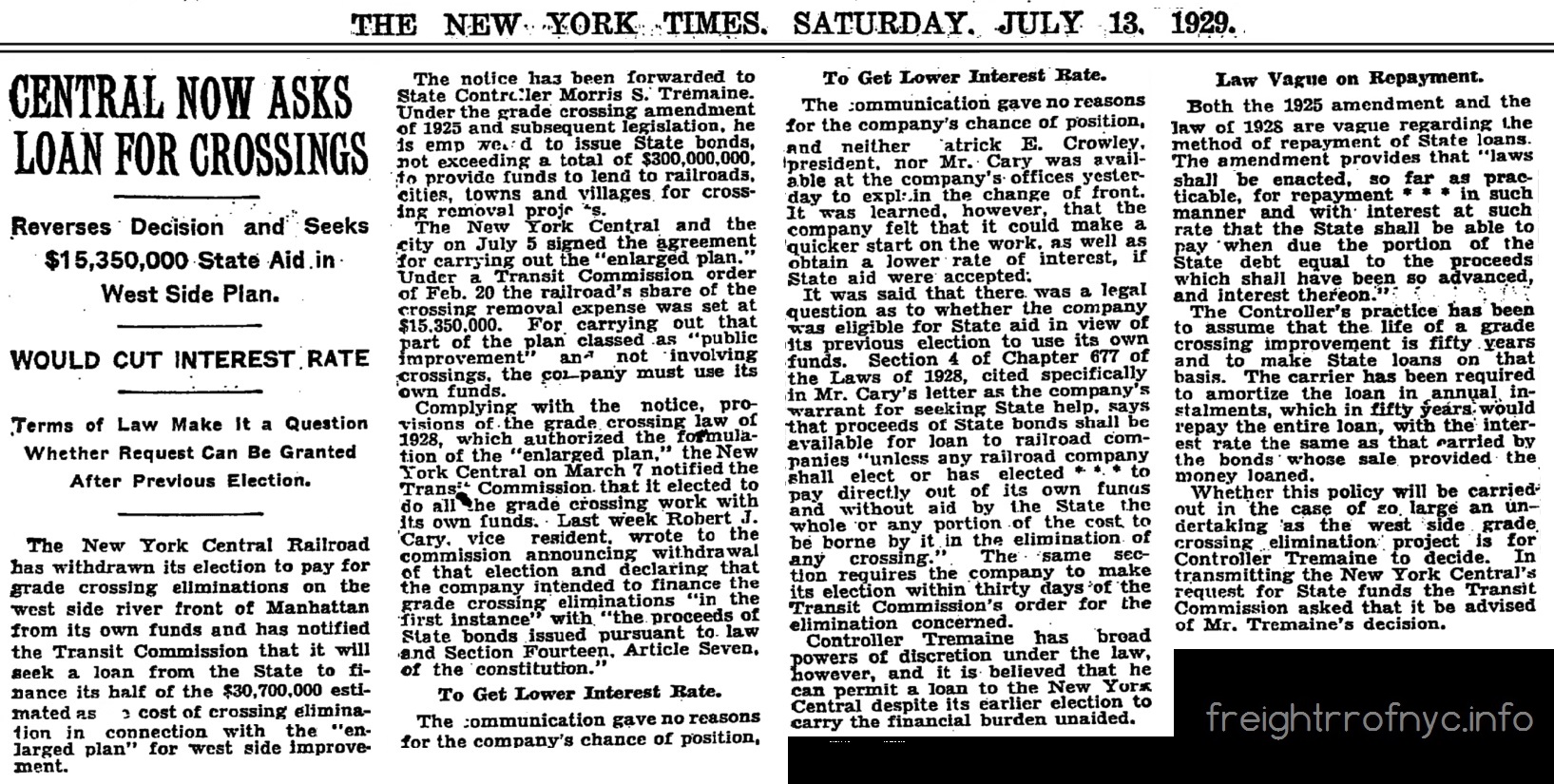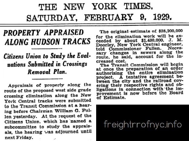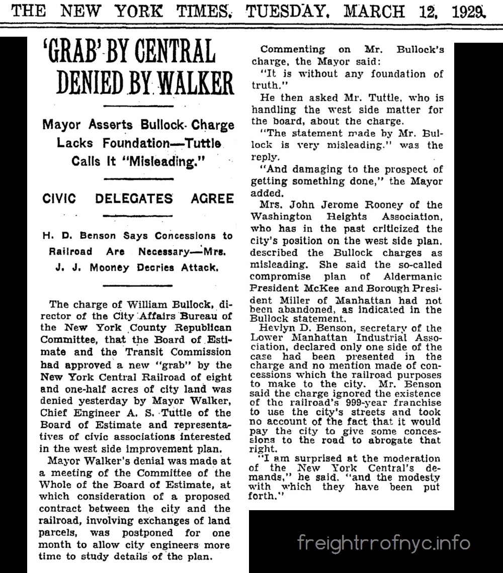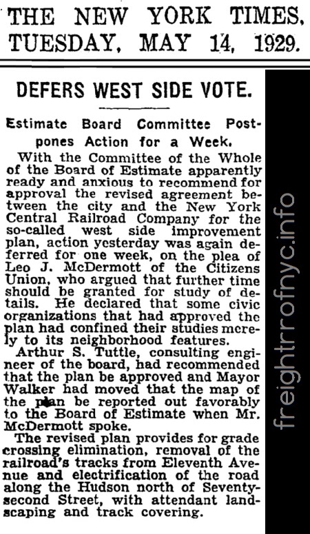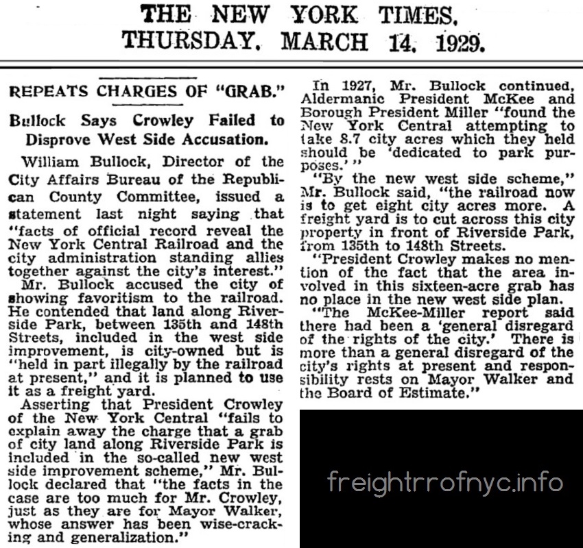 Make no mistake, the New York Central wanted their operations off the streets of lower Manhattan as well; and as the City owned the streets, there was little recourse. As for the Riverside Park vicinity, the Central apparently owned it rights of way through portions of the park. When it came to who was going to pay for these "improvements", the railroad accepted the fact they would have to pay for most of it, but they rightfully were not going to pay for all of it. And the issue wasn't simply about money. There were also matter of property ownership and rights involved. The Central had property and rights that the City wanted, particularly through Riverside Park. The City had property and rights that the Central needed to relocate their tracks. The City; or more accurately, the community boards and resident organizations; were adamant about not giving up a square inch; "the parkland must be preserved." This left the railroad in a position frequently known as being between a rock and hard place. It could not relocate without some acquisition of land, and the City wanted the railroad to give up a lot of what it owned in the name of community improvements. The affluents that resided along Riverside Drive were adamant about not giving up and city parkland for the railroad, but yet they wanted the railroad to move. That is pretty much it in a nutshell. One of the more succinct outlines of the issue comes from the following document: West Side Improvement - 22nd Annual Report of the American Scenic & Historical Preservation Society - 1917 but I warn you, its 32 pages in length. That demonstrates how complicated the issue was. And in April, the United States entered World War I and changed the priorities for several years. But, while both minor dithering between the City and the Railroad commenced, and some major dithering in Europe; the freight demands of Manhattan was growing at an exponential rate. Thus began over a decade of negotiations, plans, counter-plans, court hearings and compromises; before an actual shovelful of dirt was moved. The specific details are contained within the following three references (the first two of which are open source):