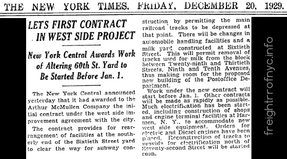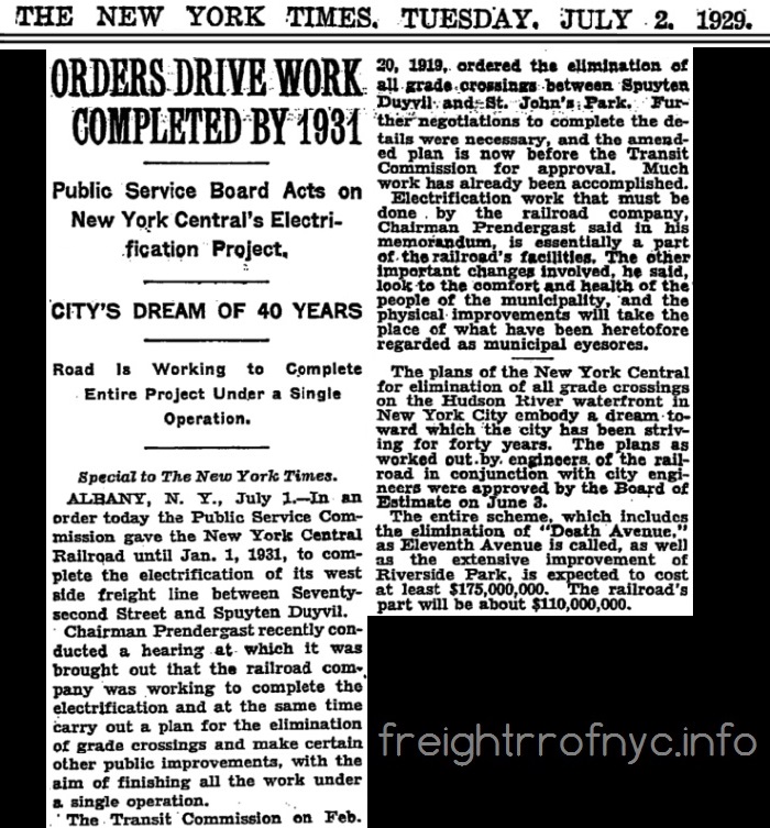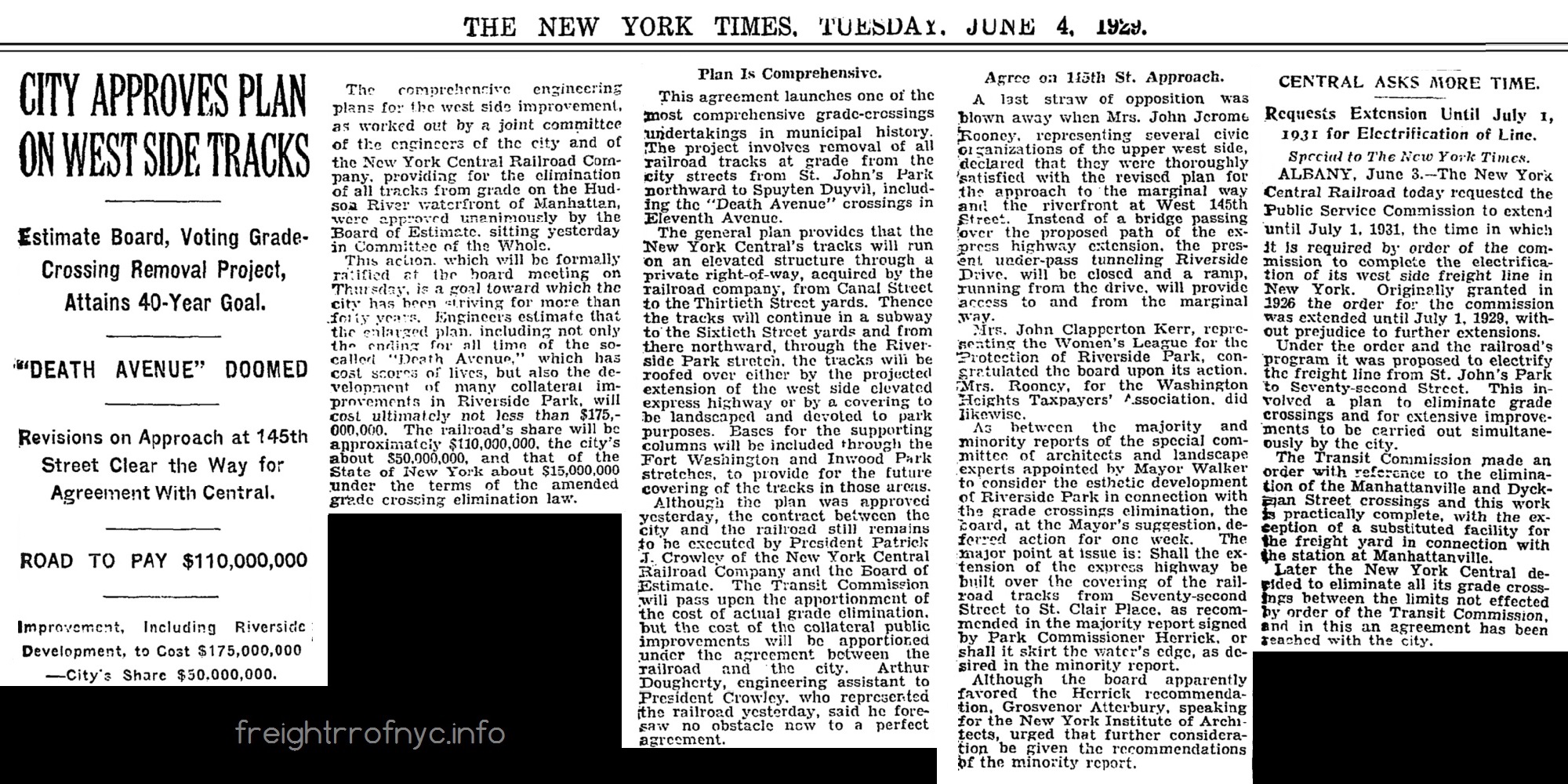 | electric operation to West 30th Street, switching and service south of West 30th Street by diesel electric, Elimination of 105 street crossings, discontinuance of steam locomotives, development of Riverside Park |
