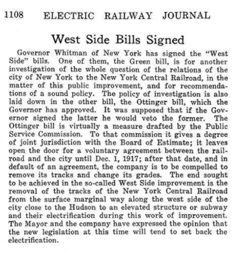 And when the automobile was developed, entered mass production and became available to the private owner; automobiles increasingly caused death on the streets as well. So many injuries and deaths were occurring as a result of automobiles, that the New York Daily News began a clock-like "Hands of Death." The latest one in 1923 showed 889 people killed by "the automobile". In 1931, deaths as a result from automobiles reached 1,448. Yet, only a few people and politicians actually advocated banning the automobile from streets. Speed limits, perhaps; but not an outright ban. If one does the math, more people died from the automobile in the first 30 years of the 1900's, than in all of the 80 years the freight trains operated on the West Side since 1851. But it was the "big, bad freight railroad" that bore the brunt of the blame, and was an easy target. And while people needed the trolleys to go to and from work and school, go about their daily lives and what have you; they were an essential public service. Most transit companies of the era were considered "locally" owned. The perception was (and remains) the freight trains weren't. At best, they might have been incorporated in the State of New York, but their corporate offices may have been out of state.And even though the New York Central Railroad's headquarters were located right in New York City by Grand Central Terminal; they, like the other railroads were perceived to be owned by a faceless corporation owned by the ultra-rich, living in mansions along Fifth Avenue; while most of the rest of the population were crammed into tenements. The railroads always have and always will bear unjust ire and blame by the public, even to this day: .