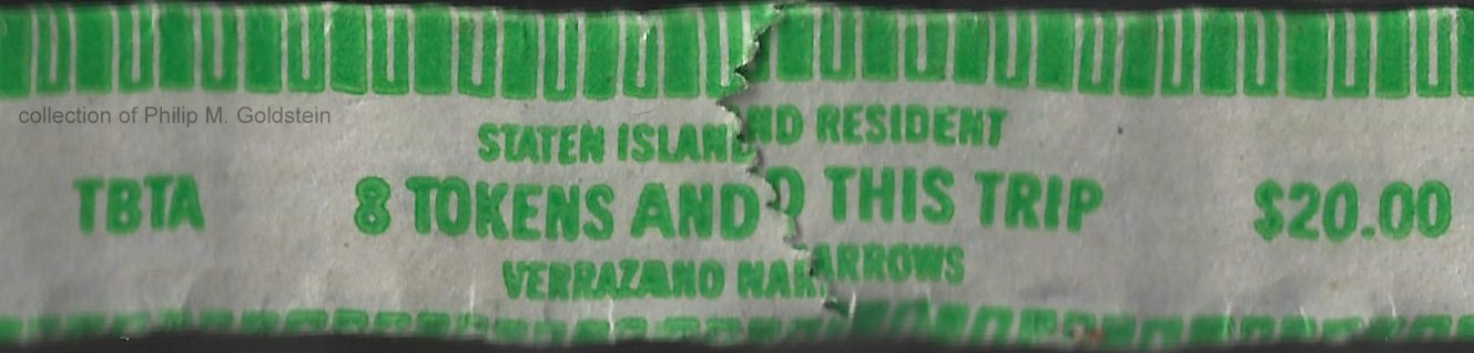 Presently unseen, but expected to exist are rolls of 20 tokens for $26.00 ($1.30 each) and rolls of 20 tokens for $24.00 for Staten Island Residents. These rolls are expected to exist because of the following advertisement released by the TBTA for the upcoming January 3, 1984 toll tariff: From "20 tokens and a free trip" to "19 AND THIS TRIP"