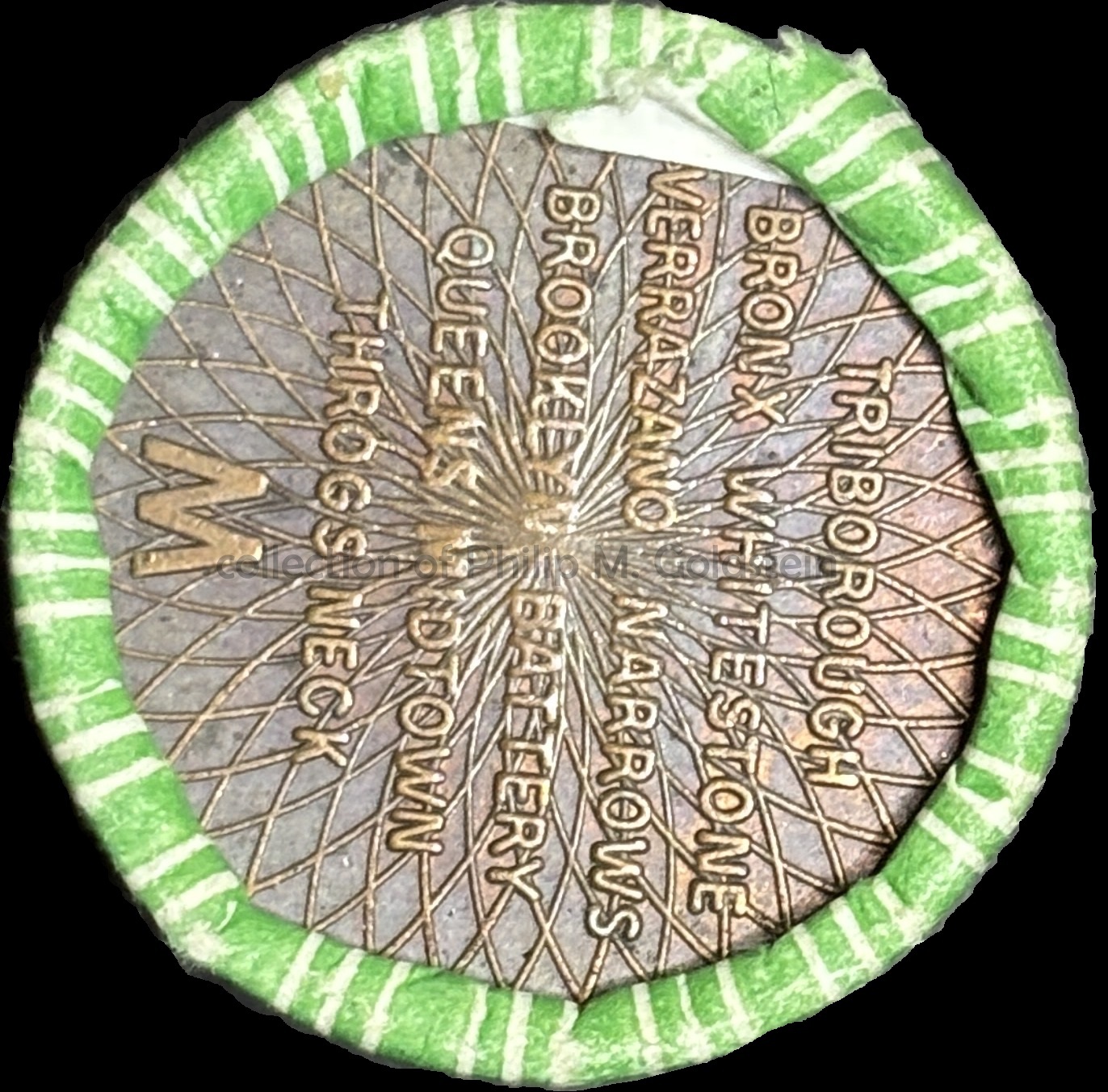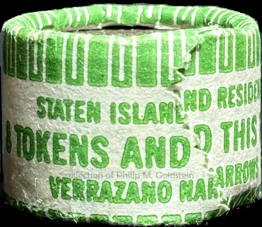 What is surprising to learn, is that the standard Major Crossing "List" token was also utilized for this Staten Island Resident discount roll. By use of the same token design, this in theory could allow a Staten Island Resident discounted driver to use a single token (purchased at the $1.60 Staten Island resident discount rate) at any of the other Major TBTA crossings, for 10 cents less rate than the standard token discount: $1.70 for other drivers. However, this would be at the expense of "throwing off" the Staten Island Residents appropriate count for their Staten Island crossing. All things considered, this apparently could not be too much of a concern, with what I would hypothesize the TBTA concluding the 10 cent loss was more than made up for with the double tolling at Verrazano Bridge. When the Staten Island Resident discount was first implements, the TBTA used the same NY630BD Major Crossing "List" token, and not a special marked token as we would see with the later issue. The following roll is shown for reference not inclusion.