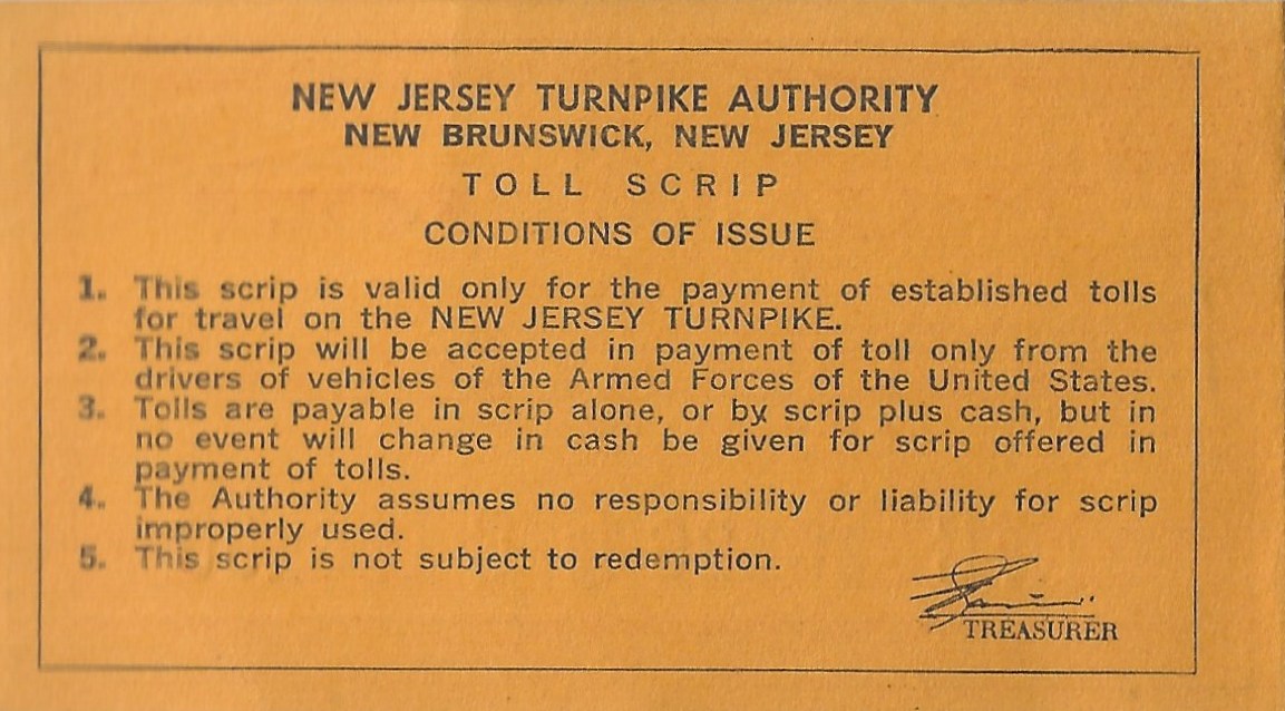 It had not been mentioned until now that New Jersey Turnpike scrip was to be used by military personnel only